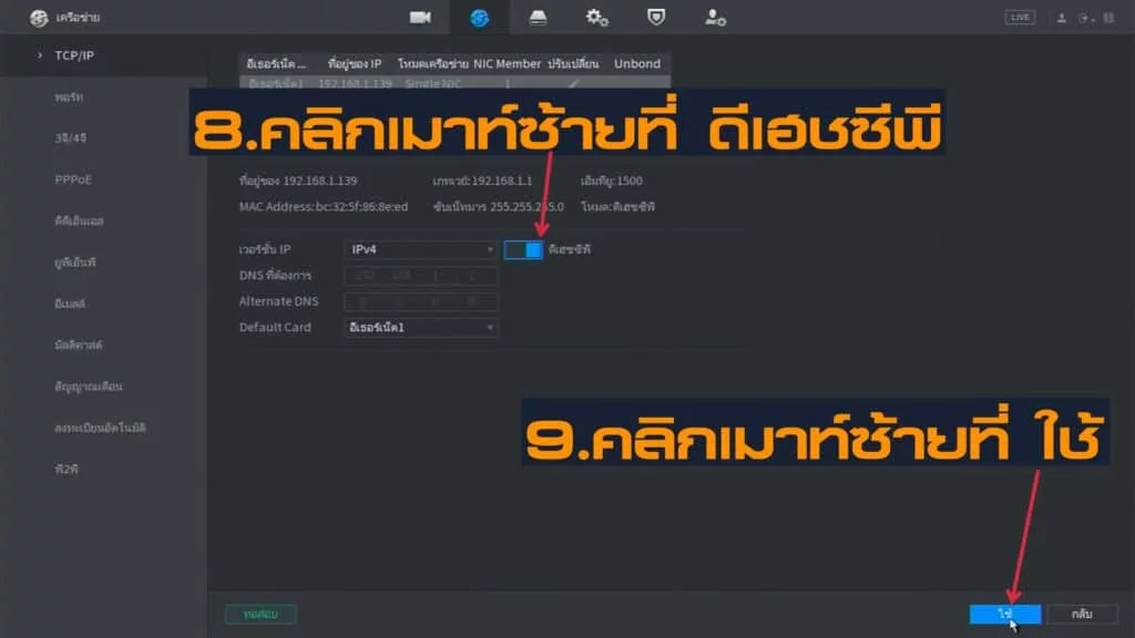 8.ตั้งค่า ดีเอ็นเอส(DNS) ให้เป็น ดีเฮชซีพี โดยคลิกเมาท์ซ้ายที่ ดีเฮชซีพี
